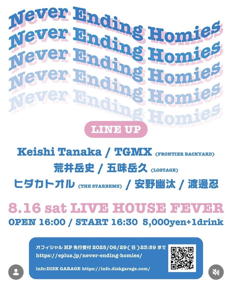 Never Ending Homies 2025 SCHEDULE 2025/08/16(土) 新代田FEVER 地図を表示 OPEN 16:00 / START 16:30 出演:Keishi Tanaka / TGMX / 荒井岳史 ... 16:00 URLをコピーする 報告する